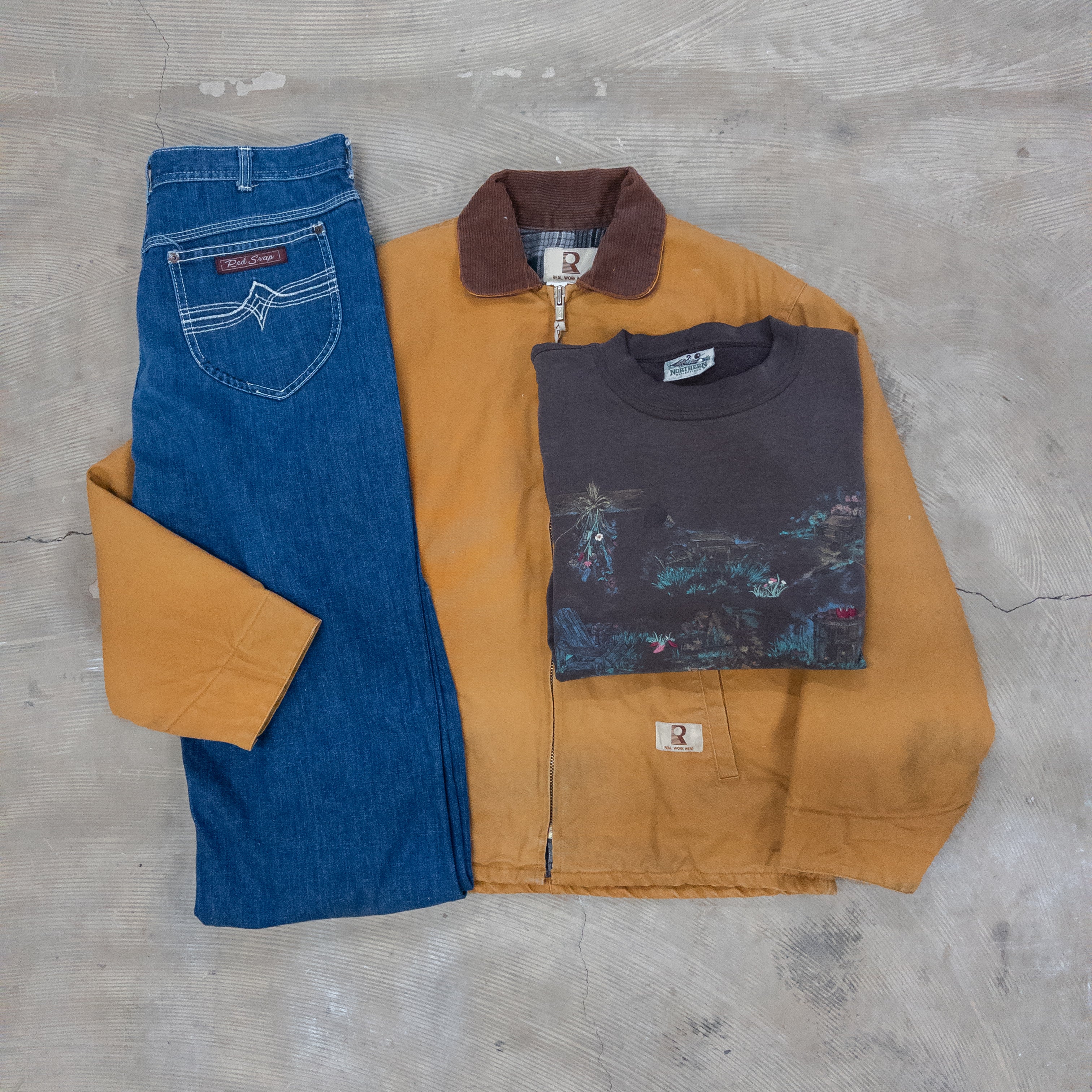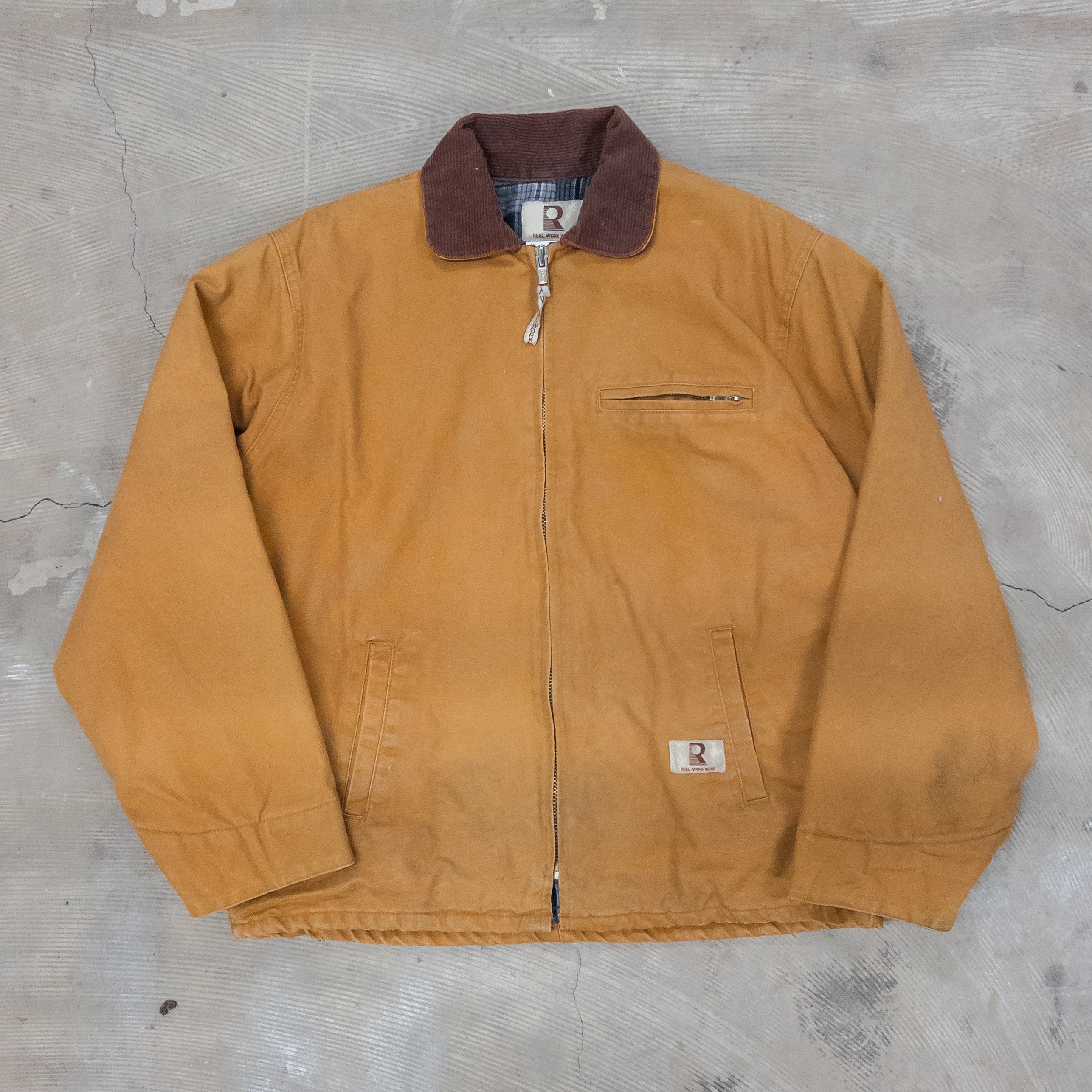 古着市場で最も支持されるタフアウター。厚手のキャンバス地は着込むほどに味が出て、ワーク由来の無骨さがストリートに映える。羽織るだけで“存在感”を背負える一枚。 -