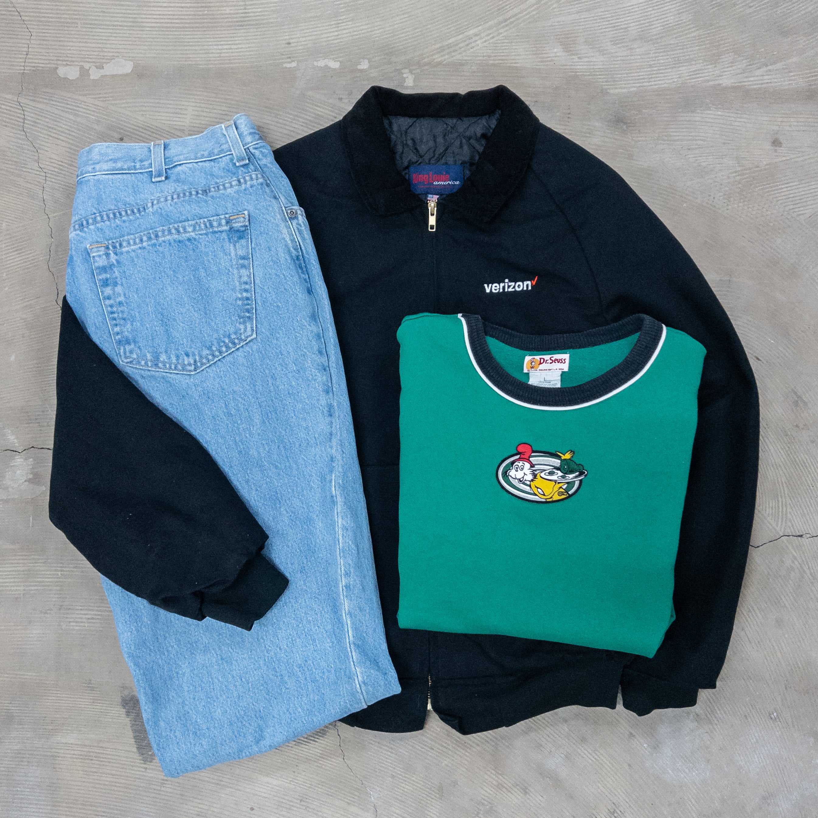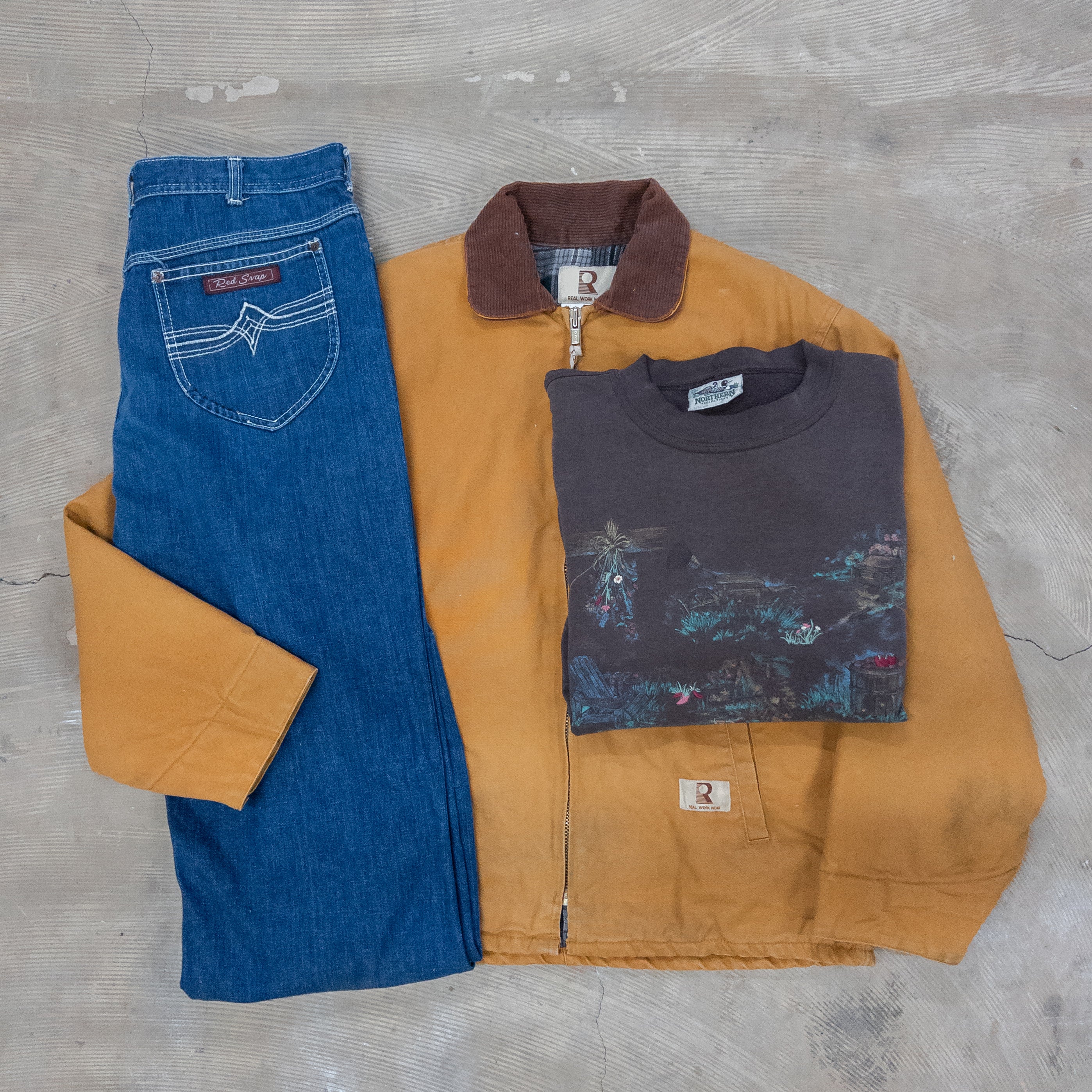 全体のバランスを見て組んでいます。こんな古着が入ります(一例)👇