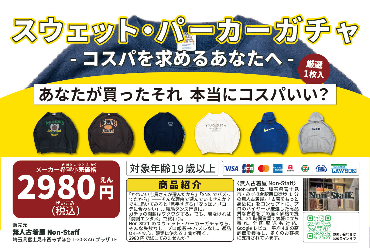 Non-Staffのスウェット・パーカーガチャなら、そんな失敗はない。